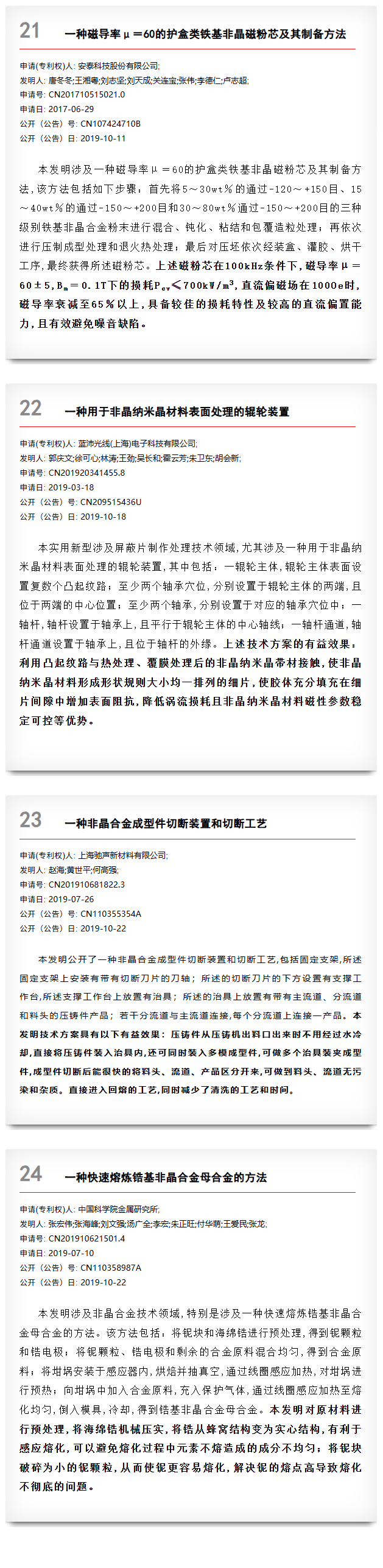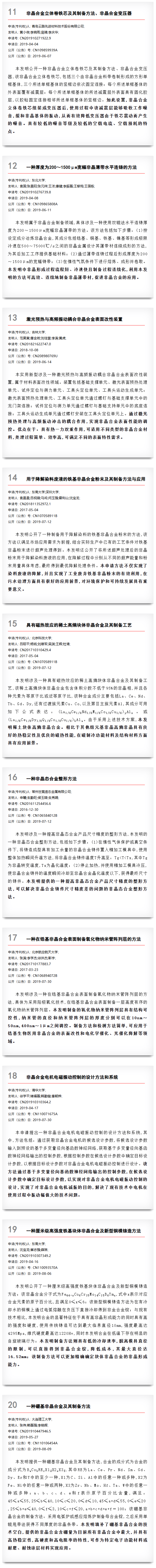 2019年度非晶合金优秀专利选