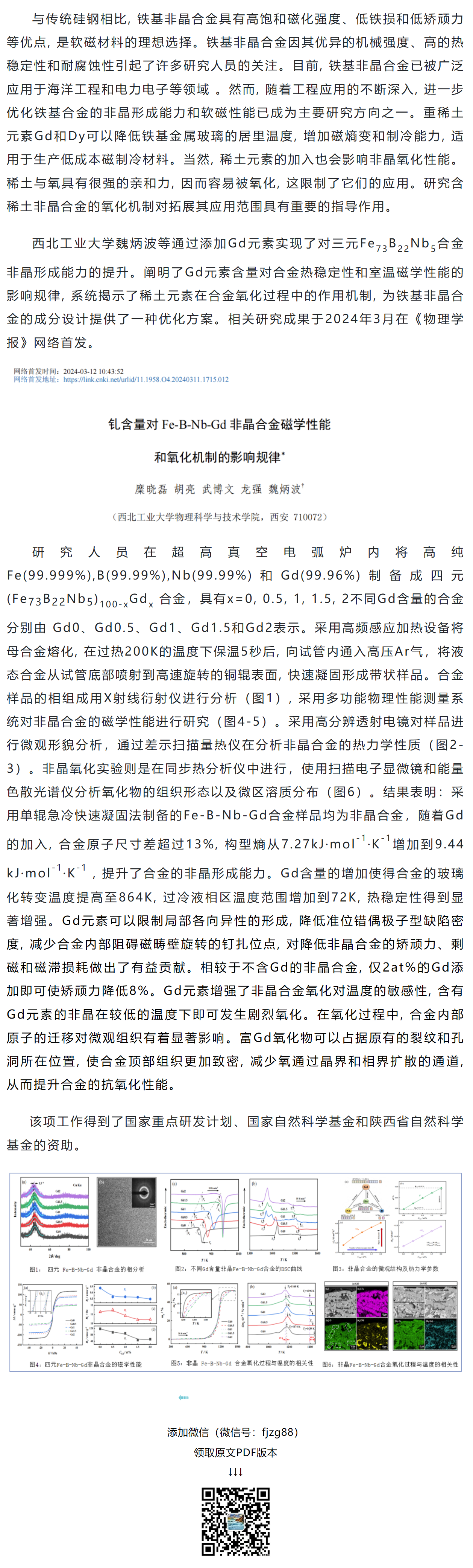 《物理学报》魏炳波等工作:钆含量对Fe-B-Nb-Gd非晶合金磁学性能和氧化机制的影响规律