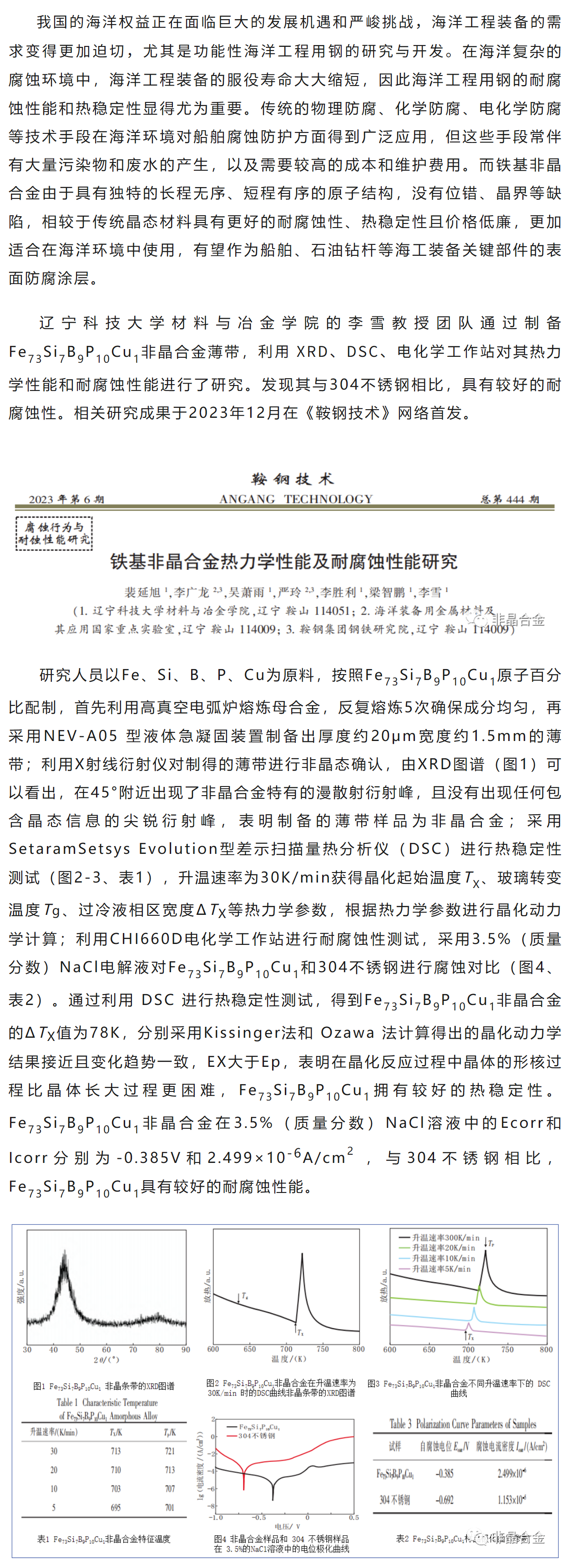 《鞍钢技术》李雪等工作:铁基非晶合金热力学性能及耐腐蚀性能研究